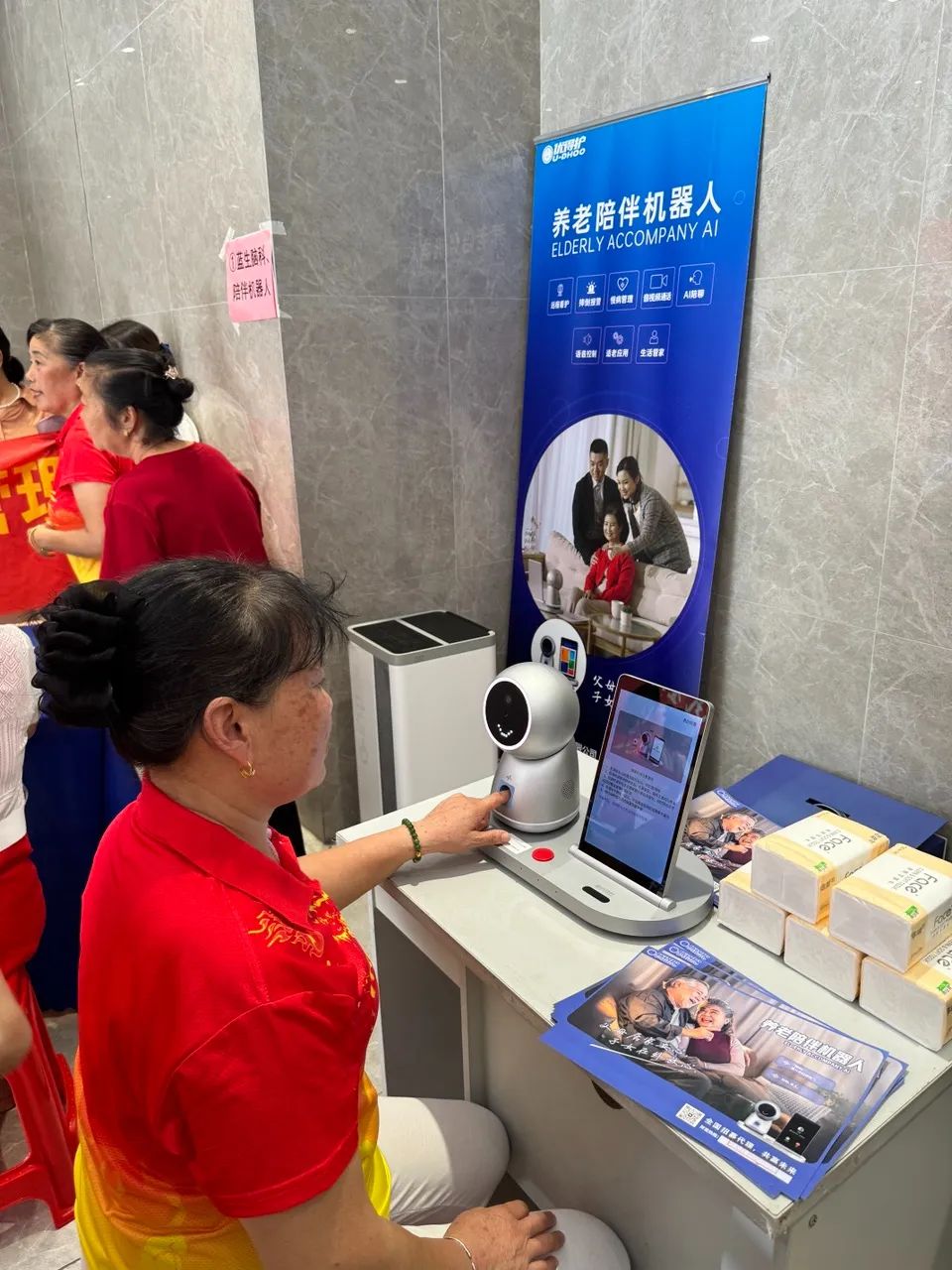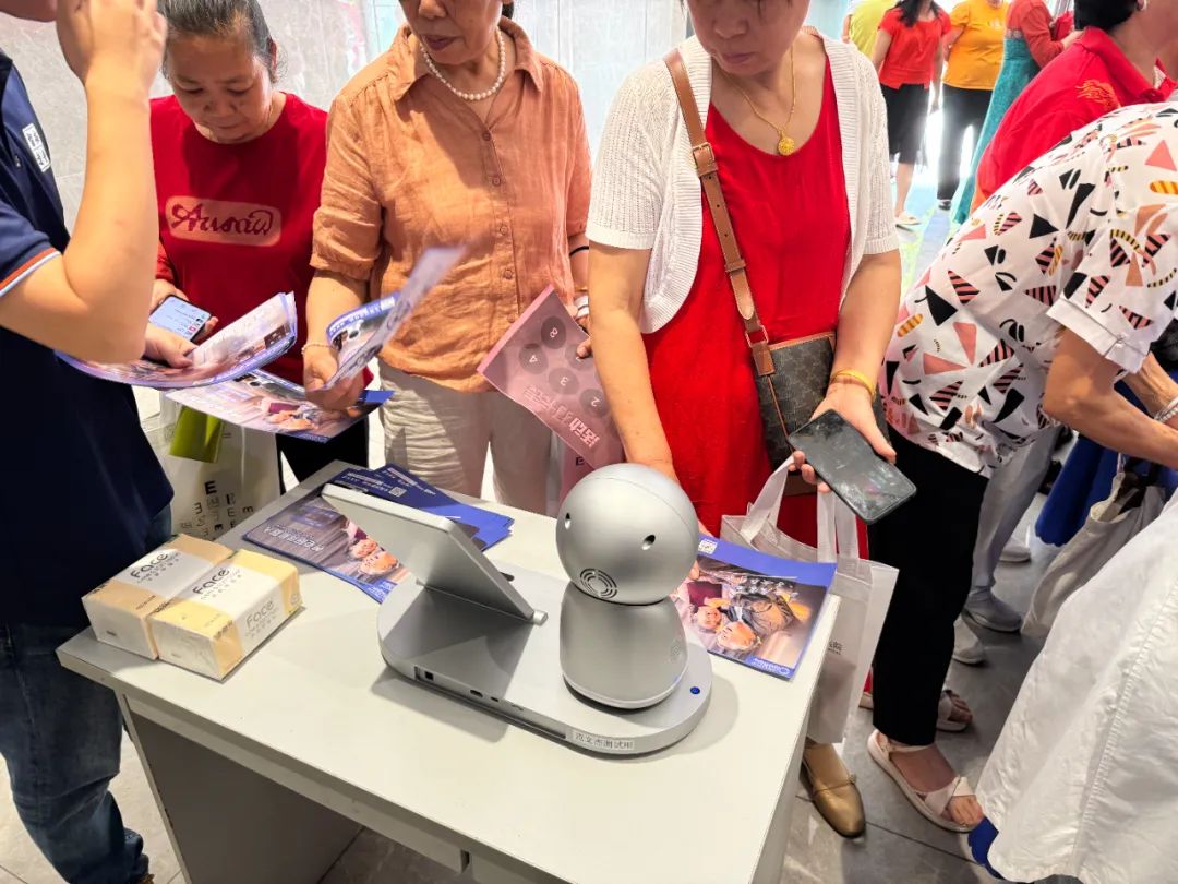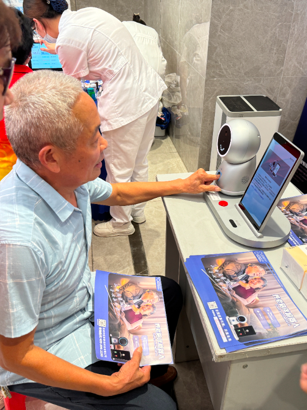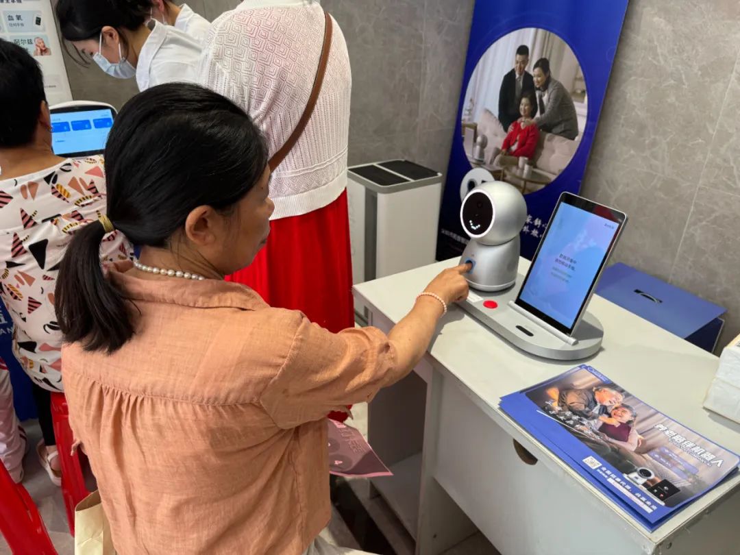 在活动现场优得护养老陪伴机器人的展台前,年长居民们纷纷排队体验健康监测功能,通过集成的高精度传感器,实时了解自己的心率、血压、血氧、疲劳度等10项健康数据。